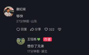 国字号队友蒯纪闻在评论区留言:“够快。”王钰栋回复道:“想你了兄弟。”